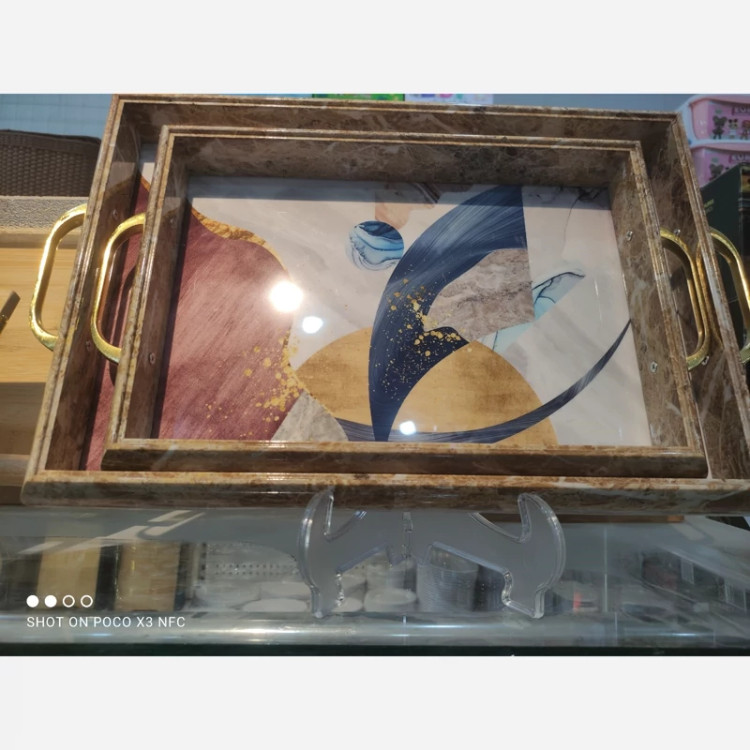 ست سینی دوقلو طرح بدنه مرمر طرح چوب وارداتی بسیار یا کیفیت دسته فلزی طلایی عکس بدون فیلتر جهت نمایش قرار داده شده سایز40در 30 سایز 30ذر 25