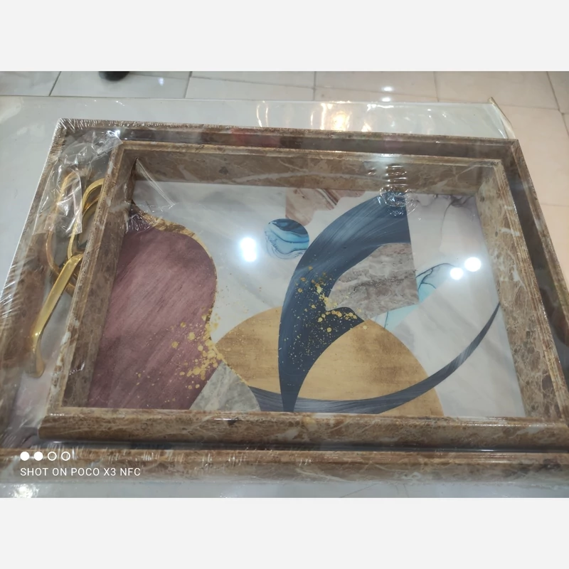 ست سینی دوقلو طرح بدنه مرمر طرح چوب وارداتی بسیار یا کیفیت دسته فلزی طلایی عکس بدون فیلتر جهت نمایش قرار داده شده سایز40در 30 سایز 30ذر 25