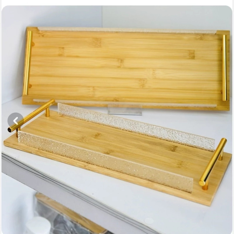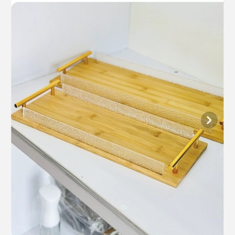ابعاد 46در 18 و 40در 15 سینیهای چوبی بامبو را با دستههای فلزی طلایی نشان میدهد. این سینیها در بستهبندی پلاستیکی قرار دارند و برای خرید موجود هستند. این سینیها از جنس بامبو هستند که مادهای پایدار و بادوام است. دستههای فلزی طلایی به زیبایی و کارایی آنها میافزایند. این سینیها برای سرو غذا، نوشیدنی یا حمل وسایل مختلف مناسب هستند.