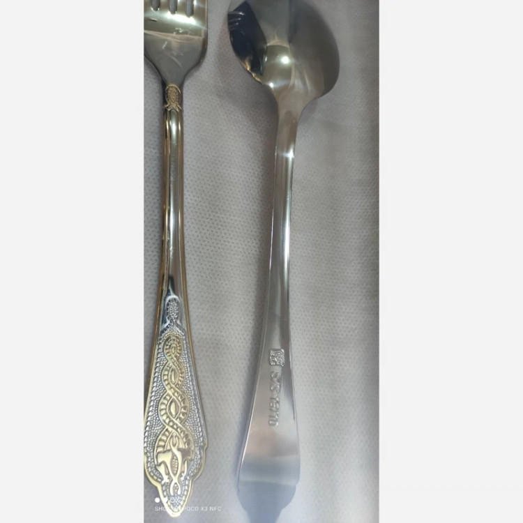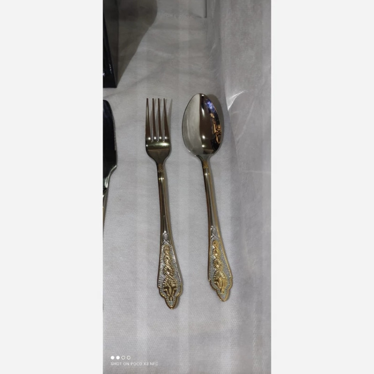 جنس فوق العاده با کیفیت برند btc رنگ استیل طلایی استند استیل نقره ای رنگ 6عدد قاشق چنگال غذاخوری 6عدد قاشق چای خوری 6عدد کارد کره پنیر خوری جنس استیل 18/10 وزن هر قاشق 50گرم