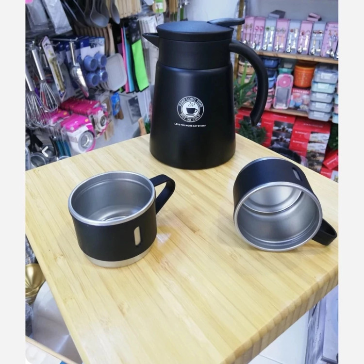 فلاسک 700میل دوعدد فنجان استیل استیل 304 رنگ مشکی و قرمز به همراه توری زیر لیوانی طلایی هزینه ارسال رایگان