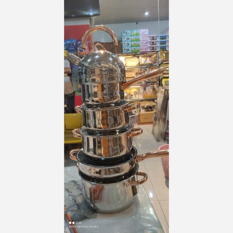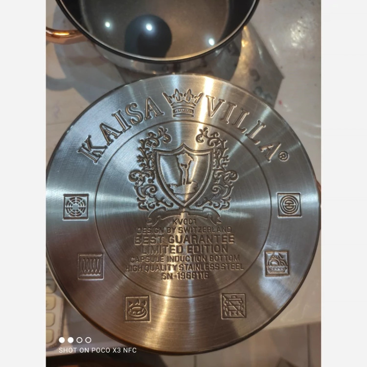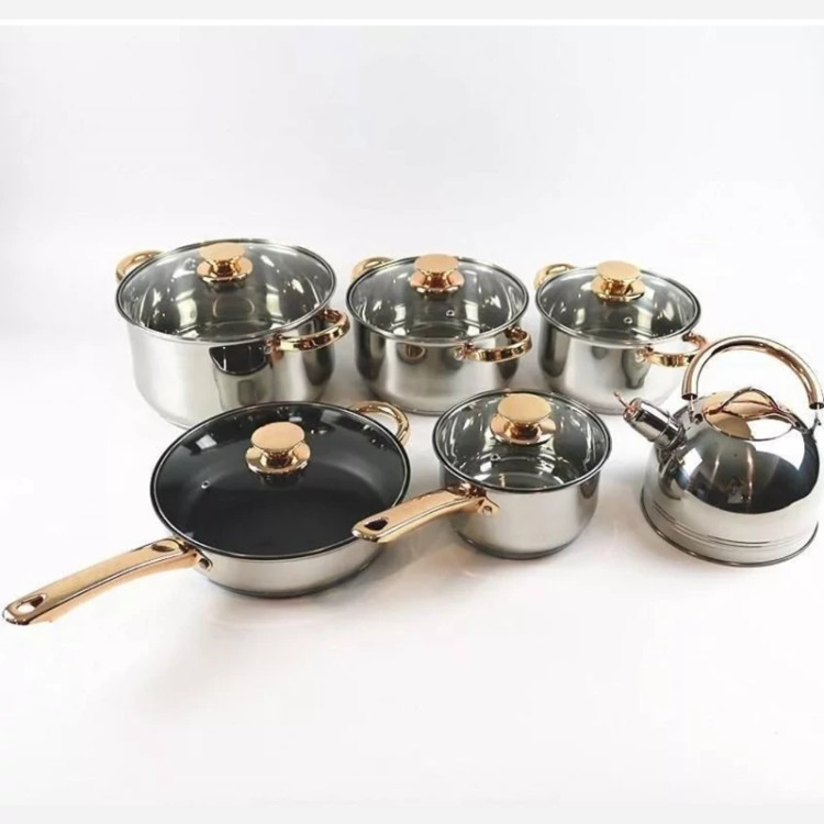 سرویس قابلمه استیل 12پارچه ویلا کائیسا وارداتی پس کرایه آهنربا نگیر طراحی سوییس شیرجوش درب دار 18سانتی 1.9لیتری قابلمه 20 درب دار قابلمه 22درب دار قابلمه 26درب دار تابه درب دار 26سانتی روکش مرمر کتری سوت دار 2.5لیتری دسته ها همگی به رنگ برنزی جنس همه درب ها پیرکس کفی ضخیم نچسب
